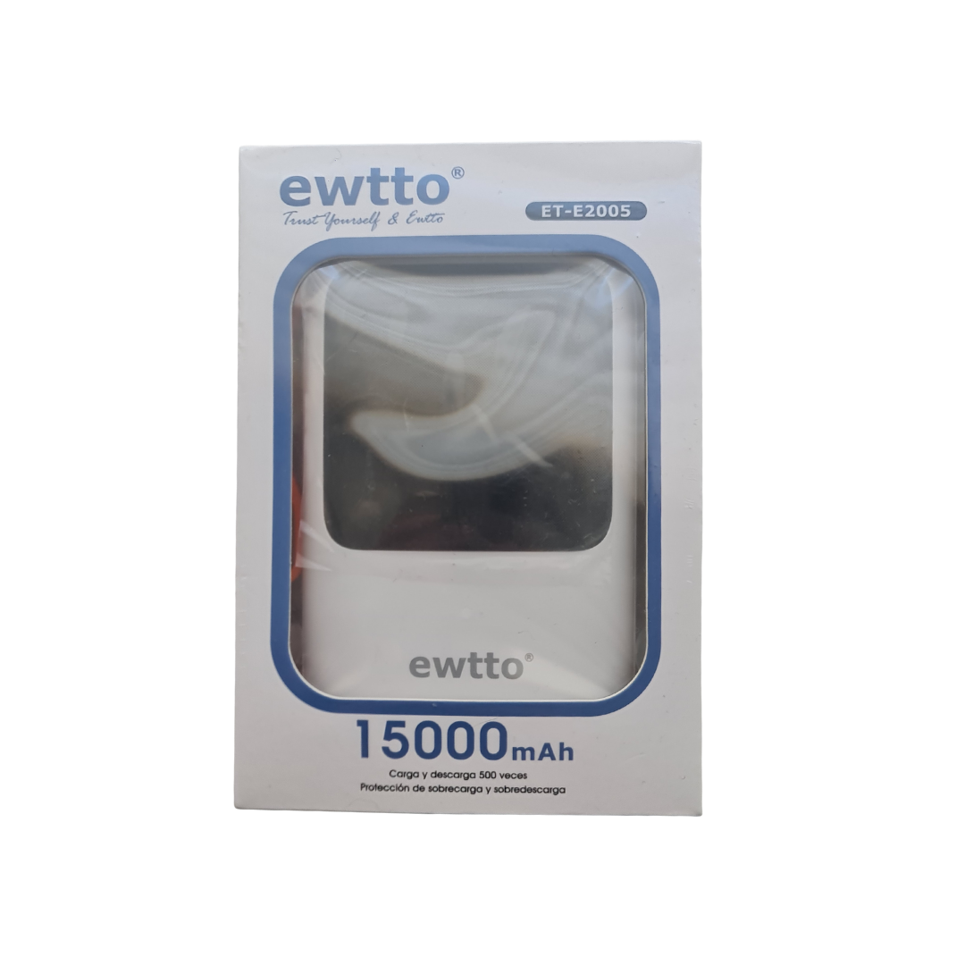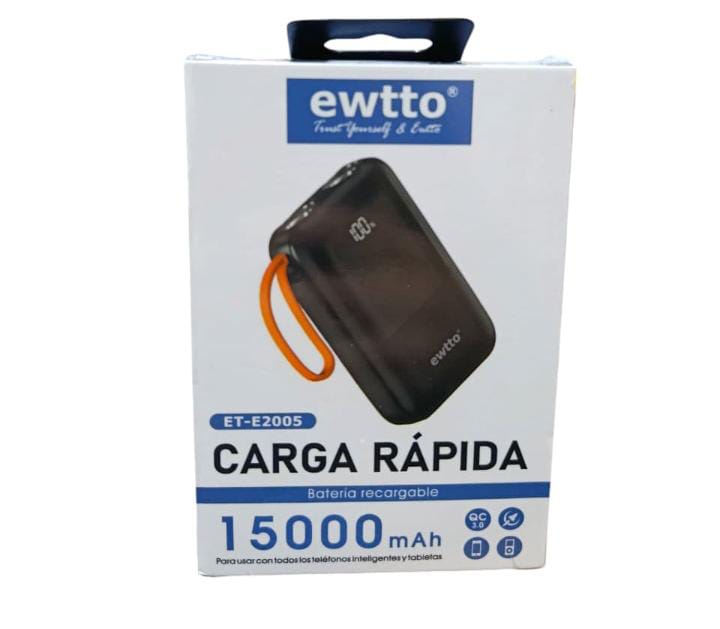 La Power Bank EWTTO de 15.000 mAh es la solución práctica y completa para cargar tus dispositivos en cualquier lugar. Con carga rápida, pantalla LED y cables integrados para múltiples tipos de conexión, es perfecta para no depender de cables extra ni buscar enchufes.